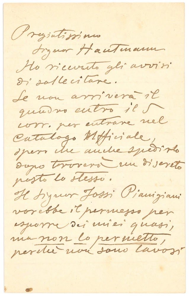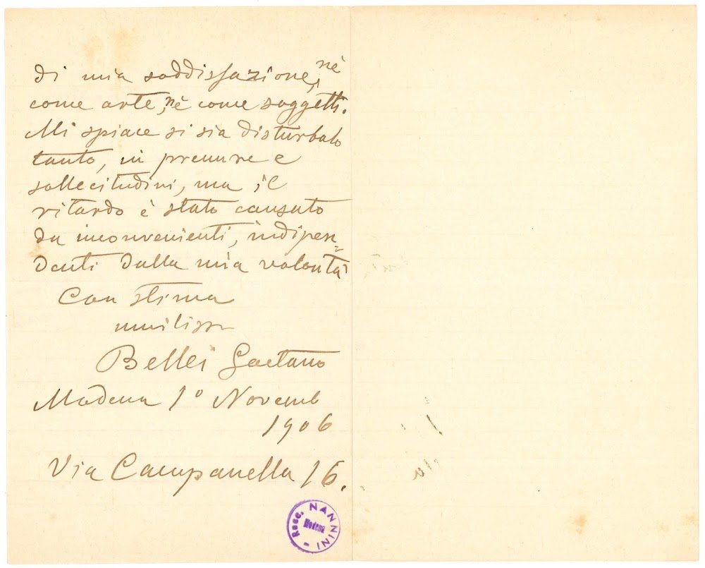 Bifolio di mm. 182x113 vergato solo alla prima carta. Timbro della collezione Nannini di Modena. Bellei si scusa per il ritardo nell'invio di un quadro, che spera possa comunque entrare nel “Catalogo Ufficiale”, qualora anche non dovesse arrivare entro il 5 del mese. Vieta poi che il Sig. Fossi Pianigiani esponga alcuni suoi lavori da lui giudicati insoddisfacenti.