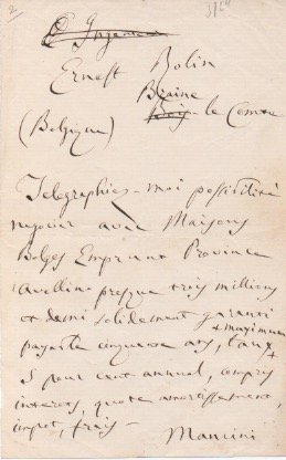 AUTOGRAFOMancini è noto soprattutto per essere stato l’autore del primo Codice di Procedura Civile per gli Stati Sardi e per aver assistito Garibaldi durante la causa di annullamento del suo secondo matrimonio con Giuseppina Raimondi. In questa lettera si rivela anche responsabile di uno dei primi “prodotti finanziari“ inventati dalle Province italiane nel XIX secolo. Il testo è inviato a Rolin, presidente della Bourse des métaux et des charbons e proprietario della storica casa belga produttrice di materiale ferroviario. «…] Telegraphiez-moi possibilité negocier avec Maisons Belges Emprunt Province Avellino presque trois millions et demi solidement garanti payable cinquante ans […]».