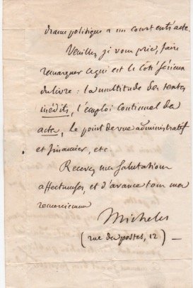 AUTOGRAFOL’autore di moltissimi testi di carattere storico, tra cui una ”Storia della Rivoluzione Fraancese” in 7 volumi, si rivolge ad un amico giornalista: ”Veuillez, je vous prie, faire remarquer ce qui est la coté serieux du livre: la moltitude des teste inédits, l’emploi continuel des actes le point de vue administratif et financier […]”.