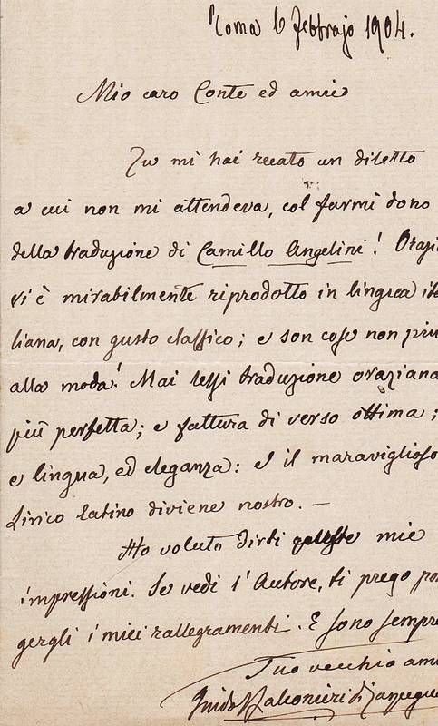Una facciata autografa dove si accenna e si ringrazia per l'invio di un volume di una traduzione dall'Orazio -(Il principe Guido Orazio di Carpegna Falconieri Gabrielli (Roma, 6 febbraio 1840 – Carpegna, 27 ottobre 1919) è stato un politico italiano. Fu poeta e traduttore dilettante. Al momento della morte ricopriva la carica di cancelliere della Consulta araldica del Regno d'Italia).