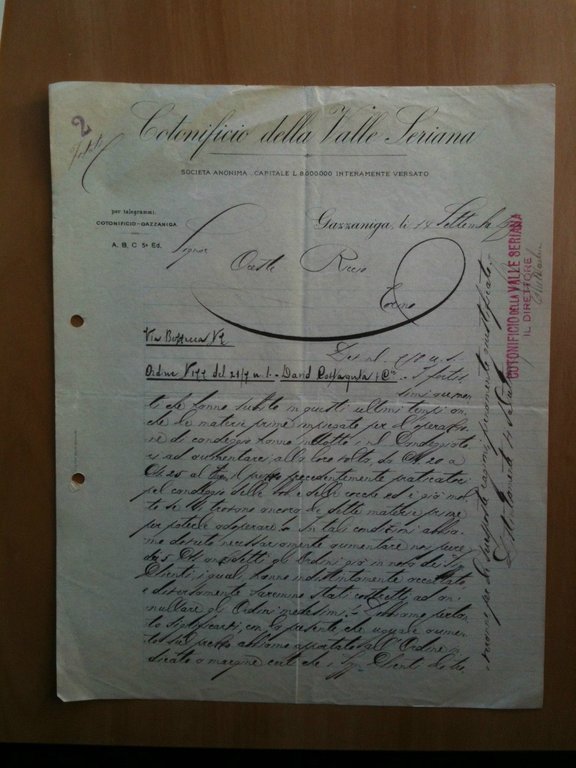 COTONIFICIO DELLA VALLE SERIANAGazzaniga14 settembre 1915formato 22x27,5 cmin buone condizioni e1479