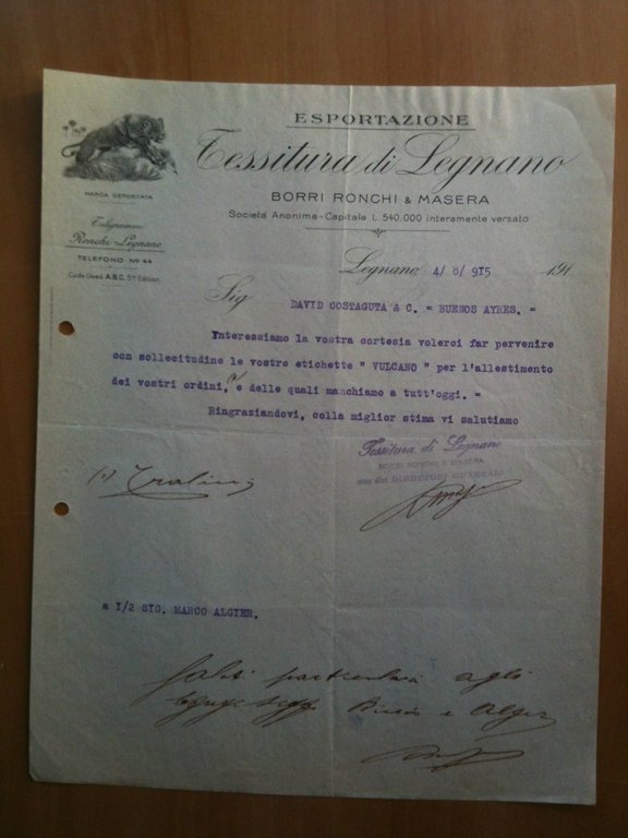 Lettera Commerciale Tessitura Legnano Esportazione Borri Ronchie & Masera 1915