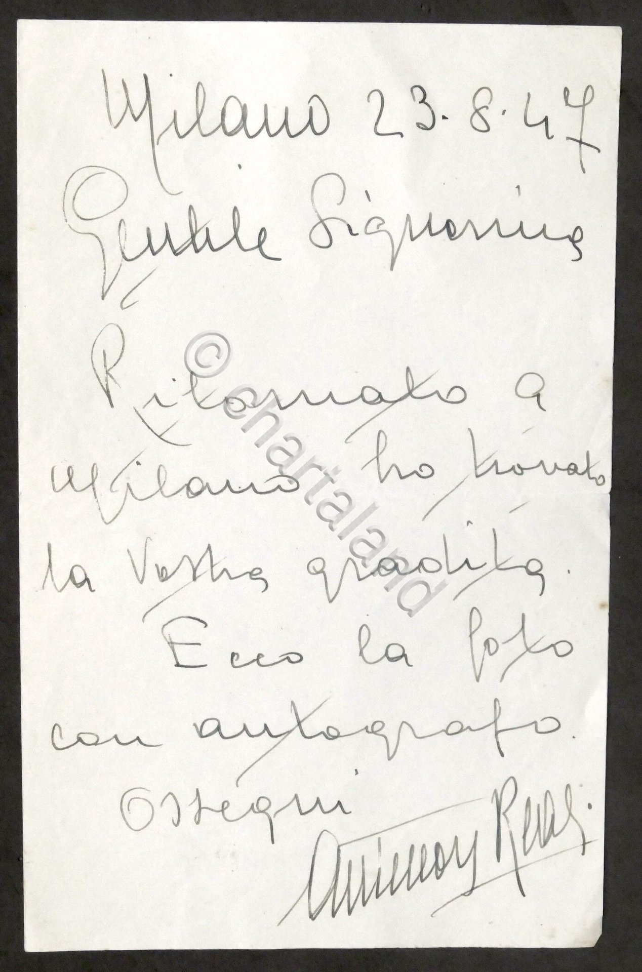 Lettera con autografo del baritono Antenore Reali - 1947
