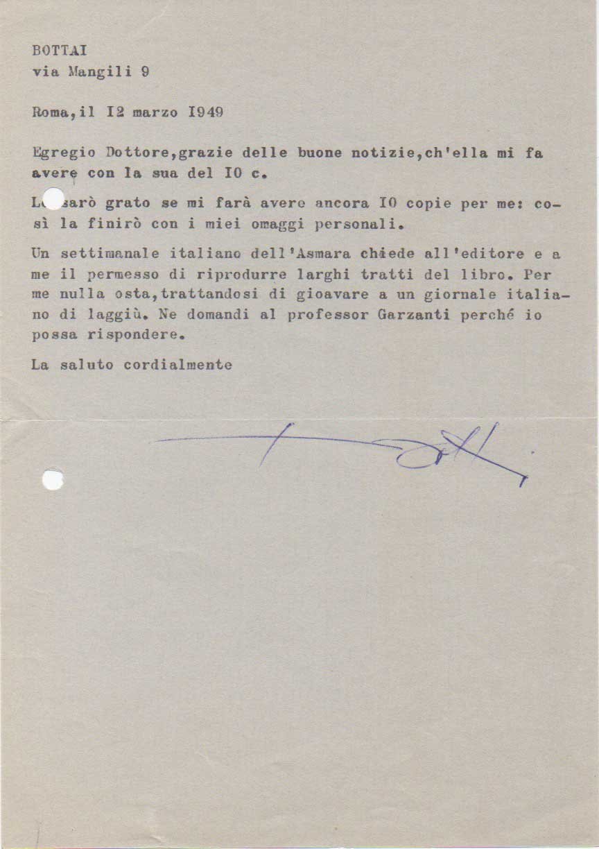 AUTOGRAFORichiesta di alcune di copie di un libro, probabilmente l'opera di Bottai "Vent'anni e un giorno" pubblicato da Garzanti nel 1949. "[…] Il settimanale italiano dell'Asmara chiede all'editore e a me il permesso di riprodurre larghi tratti del libro. Per me nulla osta […]. Ne domandi al professor Garzanti perché io possa rispondere […] ".