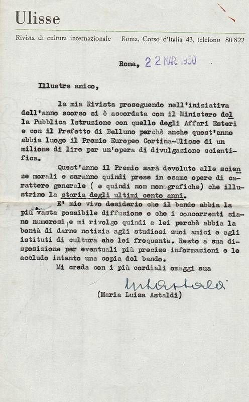 Lettera dattiloscritta per 22 righe, con firma autografa della scrittrice e studiosa udinese. Su carta intestata della 'Rivista di cultura internazionale - Ulisse', datata 'Roma, 22 mar. 1950'. M. L. Astaldi parla del 'Premio Europeo Cortina-Ulisse', da lei fondato, che quell'anno '(.) sarà devoluto alle scienze morali (.)'. Allegato il bando del concorso, dattiloscritto, perché venga diffuso.