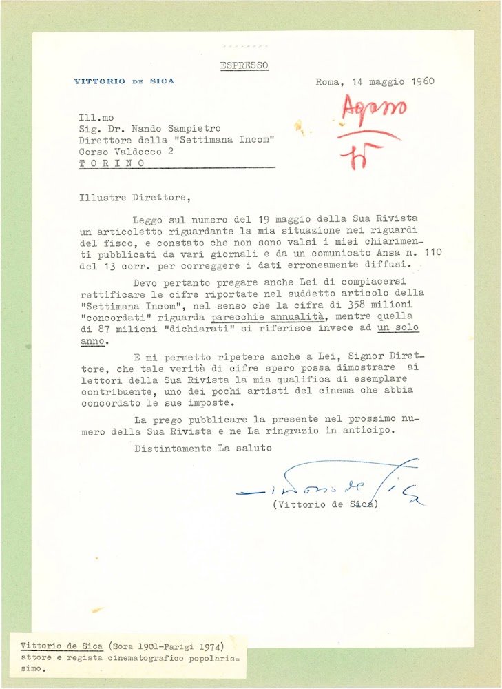 Nella lettera De Sica invia al direttore Sampietro alcuni chiarimenti riguardo le cifre del suo contenzioso con il fisco italiano a rettifica di imprecisioni da lui riscontrate in un articolo della rivista diretta da quest'ultimo.