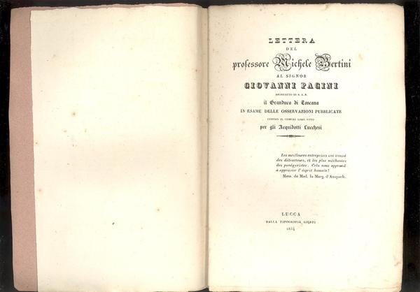LETTERA DEL PROFESSORE MICHELE BERTINI AL SIGNOR GIOVANNI PACINI ARCHITETTO DI S.A.R. IL GRANDUCA DI TOSCANA IN ESAME DELLE OSSERVAZIONI PUBBLICATE CONTRO IL COMUNE LORO VOTO PER GLI ACQUIDOTTI LUCCHESI.
