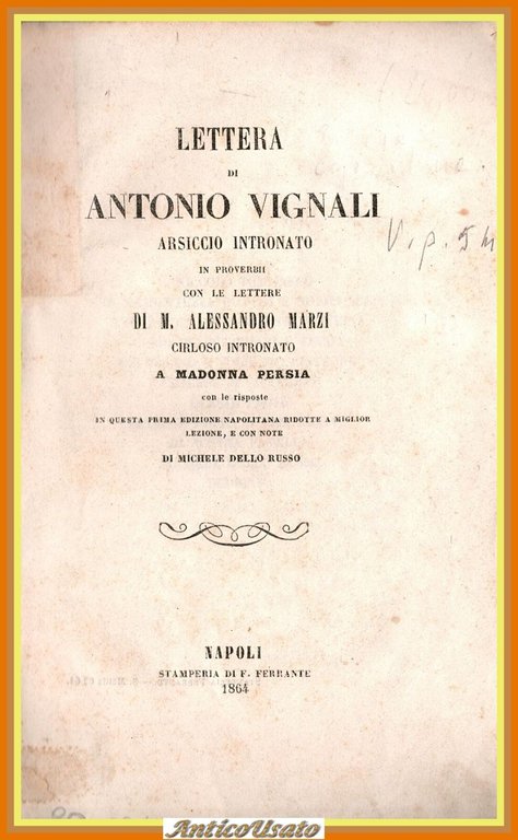 LETTERA DI ANTONIO VIGNALI ARSICCIO INTRONATO In proverbi con le lettere di M. Alessandro Marzi cirloso intronato a Madonna Persia con le risposte in questa prima edizione napolitana ridotte a miglior lezione e con note di Michele dello Russo.Napoli stamperia di Ferrante, 1864 . VIII, 545 pagine. Edizione di 250 esemplari. Copertina amatoriale in brossura muta. Stato di conservazione: molto buono (sporadiche fioriture, segni a matita al frontespizio) Libro usato saggistica