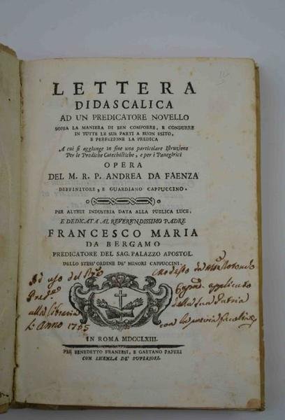 Lettera didascalica ad un predicatore novello sopra la maniera di ben comporre e condurre in tutte le sue parti a buon esito, e perfezione la predica. A cui si aggiunge in fine una particolare istruzione per le prediche catechistiche, e per i panegirici.