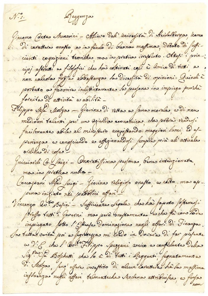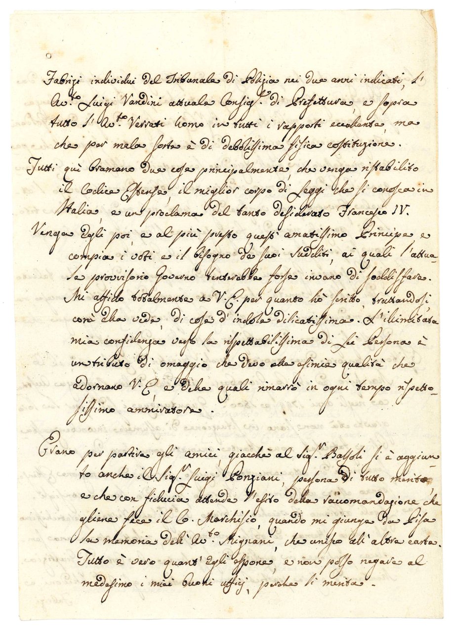 Si offre insieme un bifolio manoscritto di mm. 290x205, vergato su tutte e quattro le pagine da mano nitida ed elegante, diversa, tuttavia, da quella del bifolio precedente. Non sono indicati né il mittente né il destinatario. La lettera passa in rassegna, giudicandone pregi e difetti, diversi uomini che avevano fatto parte della Reggenza; tra questi figurano anche i tre firmatari della precedente lettera a Francesco IV. Si tratta in sostanza di una sorta di informativa segreta (l'autore raccomanda infatti assoluta discrezione) indirizzata a chi, pare, avrebbe avuto un ruolo nella scelta del prossimo gabinetto del duca, di cui ci si augura l'imminente ritorno. “Tutti qui bramano due cose principalmente, che venga ristabilito il Codice Estense, il miglior corpo di Leggi che si conosca in Italia, e un proclama del tanto desiderato Francesco IV”.