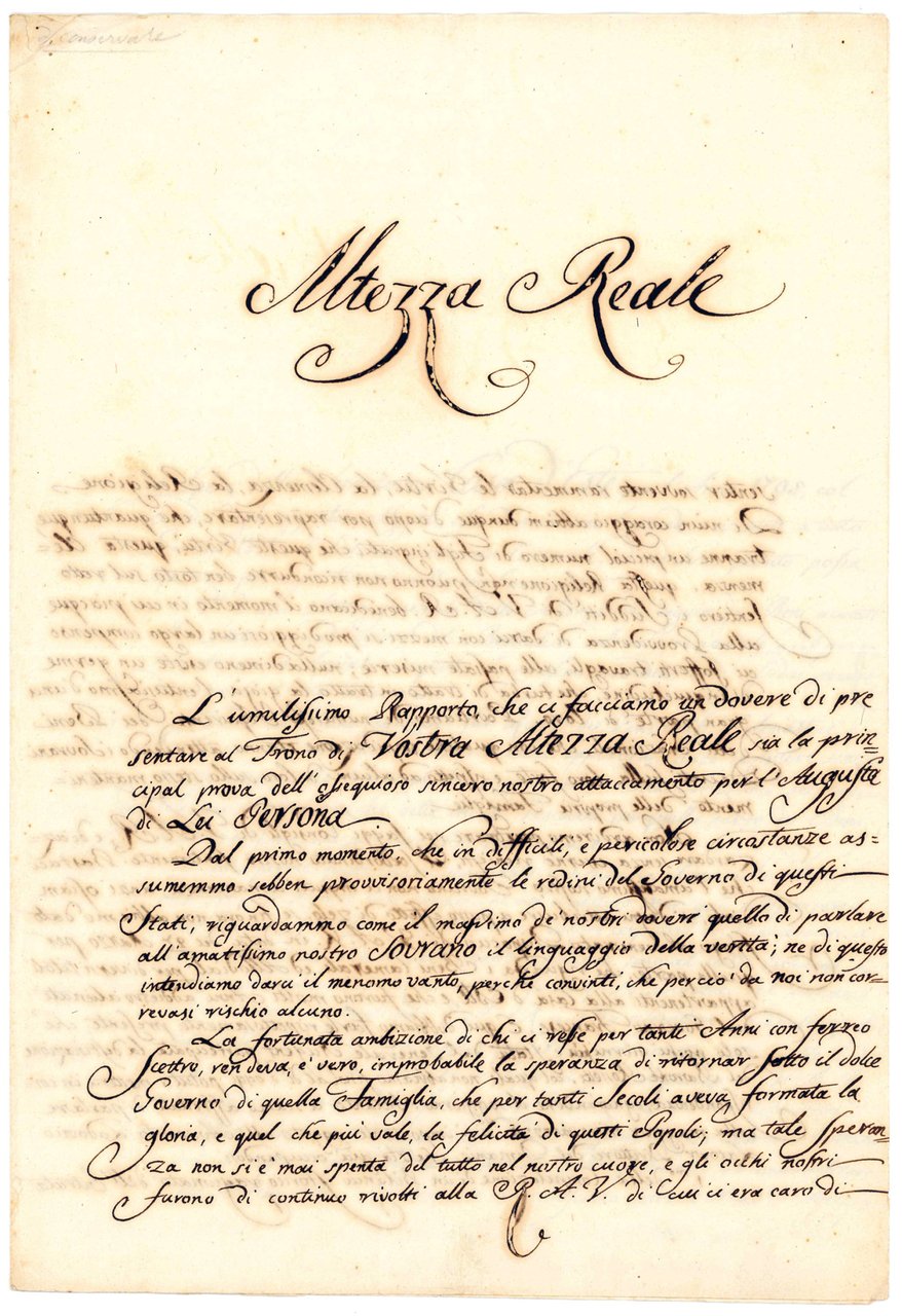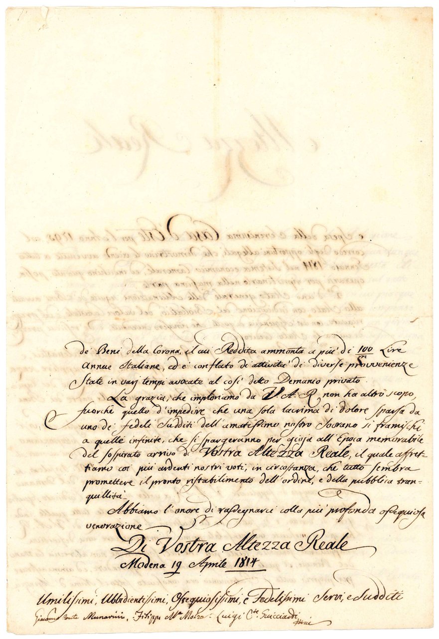 Bifolio di mm. 305x210 vergato su tutte e quattro le facciate in elegante e chiara grafia. I tre firmatari, due conti e un marchese modenesi che fecero parte della Reggenza durante il periodo di occupazione francese del Ducato Estense (1796-1814), si rivolgono ossequiosamente al duca, che fece ritorno nei suoi territori nell'estate del 1814, per omaggiarlo, felicitarsi del suo imminente rientro e del ripristino dell'ordine, e, soprattutto, per supplicarlo da parte “de' numerosi Acquirenti dei Beni detti Nazionali, che con qualche trepidazione stanno attenendo i Sovrani Decreti sulla loro sorte” di “voler sospendere l'ordinato sequestro interinale, ed a fare a tal misura procedere segretamente tutte quelle indagini di diritto, e di fatto, che la Giustizia, e la Sapienza di V.A.R. ha già riconosciute indispensabili prima di pronunziare una definitiva inappellabile sentenza”. Lo informano inoltre dei lavori avviati sul bilancio di “Casa d'Este” dal 1795 al gennaio 1814, dello “Stato generale delle Alienazioni seguite de' Beni avvocati allo Stato” e del “Piano ragionato sui Ruoli dei Pensionisti Ecclesiastici e Civili”. Gli ricordano infine che, nell'attesa della risoluzione legale di queste questioni, il duca può liberamente gestire i “Beni della Corona, il cui Reddito ammonta a più di 100/m Lire annue Italiane”.