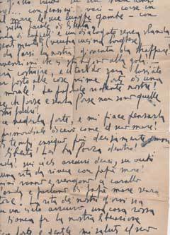 AUTOGRAFOMissiva inviata alla giovane amica a Cavi di Lavagna. «[…] di un giallo crudo e di un bleu denso di mare… con pensieri… vari. Corse in riva al mare le sue lunghe gambe con la sua scritta (?) parole di libertà. Un'onda di cappelli e un dialogato senza sbandamenti sentimentali […]. Storia da farsi la nostra gioventù da strappare! Le convenzioni che ci stringono alla gola! Bisognerà costruire […] per dar posto alle cose prime forti di una nuova morale. […] Mi piace vederla forte e mi piace pensarla libera primordiale […] come il suo mare! […] La vita dei nostri giorni va scritta su un cielo azzurro, una cosa rossa gialla bianca per la nostra […] amica forte e gentile».