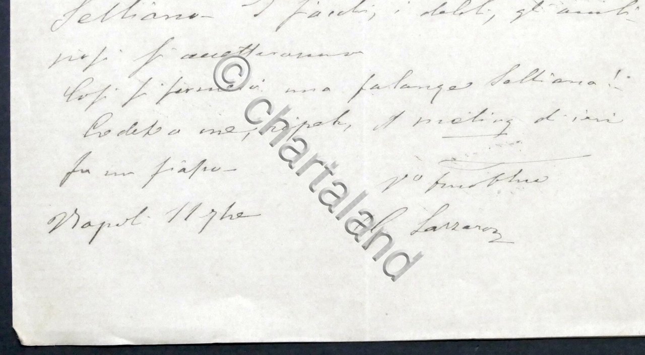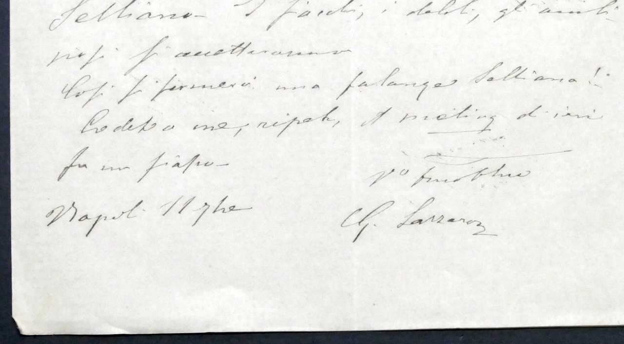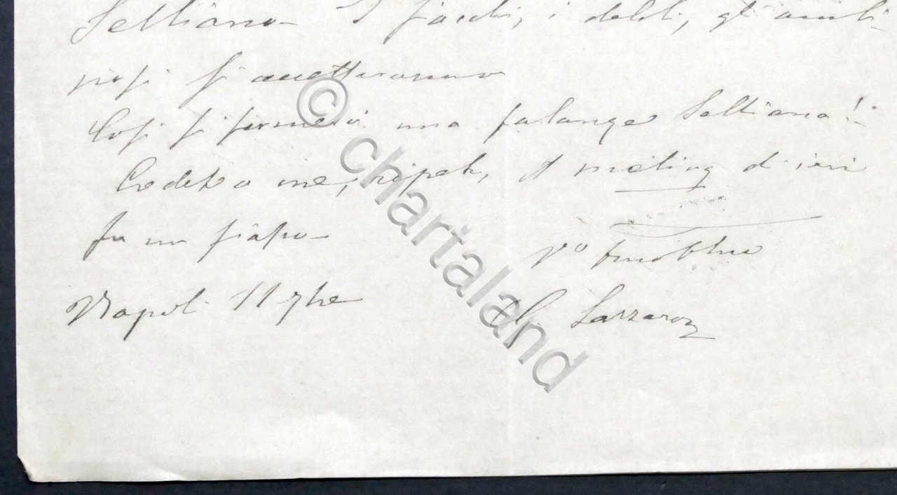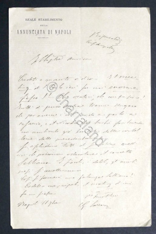 Lettera autografa di Giuseppe Lazzaro, su carta intestata Reale Stabilimento Annunciata di Napoli, di una pagina manoscritta di quattro - 1875 ca. Dimensioni: 13 x 21 cm ca. Condizioni buone. Giuseppe Lazzaro (Napoli, 6 aprile 1825 – Roma, 20 marzo 1910) è stato un giornalista e deputato del Regno d'Italia.