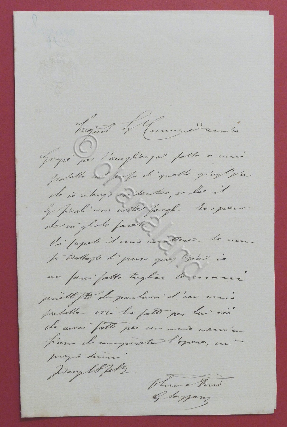 Lettera manoscritta con autografo del deputato Giuseppe Lazzaro - 1880 ca.
