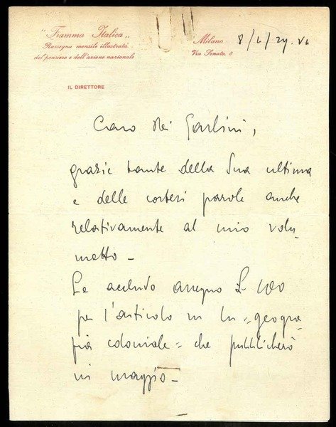 Lettera manoscritta dal direttore di "Fiamma Italica" a Mario dè Gaslini