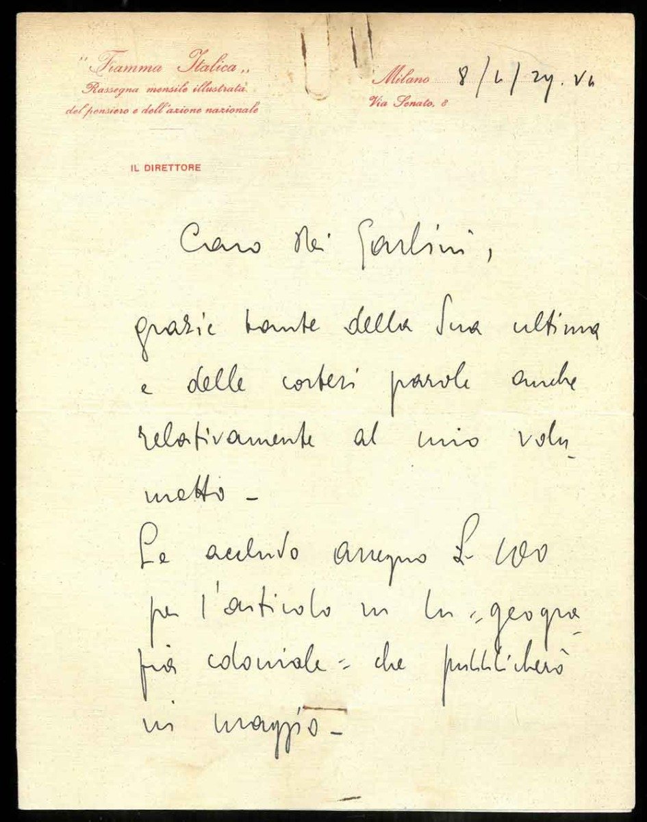 <p>21x16,5 cm, lettera di p. 4 scritta solo su due facciate, su carta intestata del direttore dela rivista "Fiamma Italica". 19 righe manoscritte per scambio di complimenti per i relativi libri da poco pubblicati da entrambi. segno di due graffette al margine superiore</p>