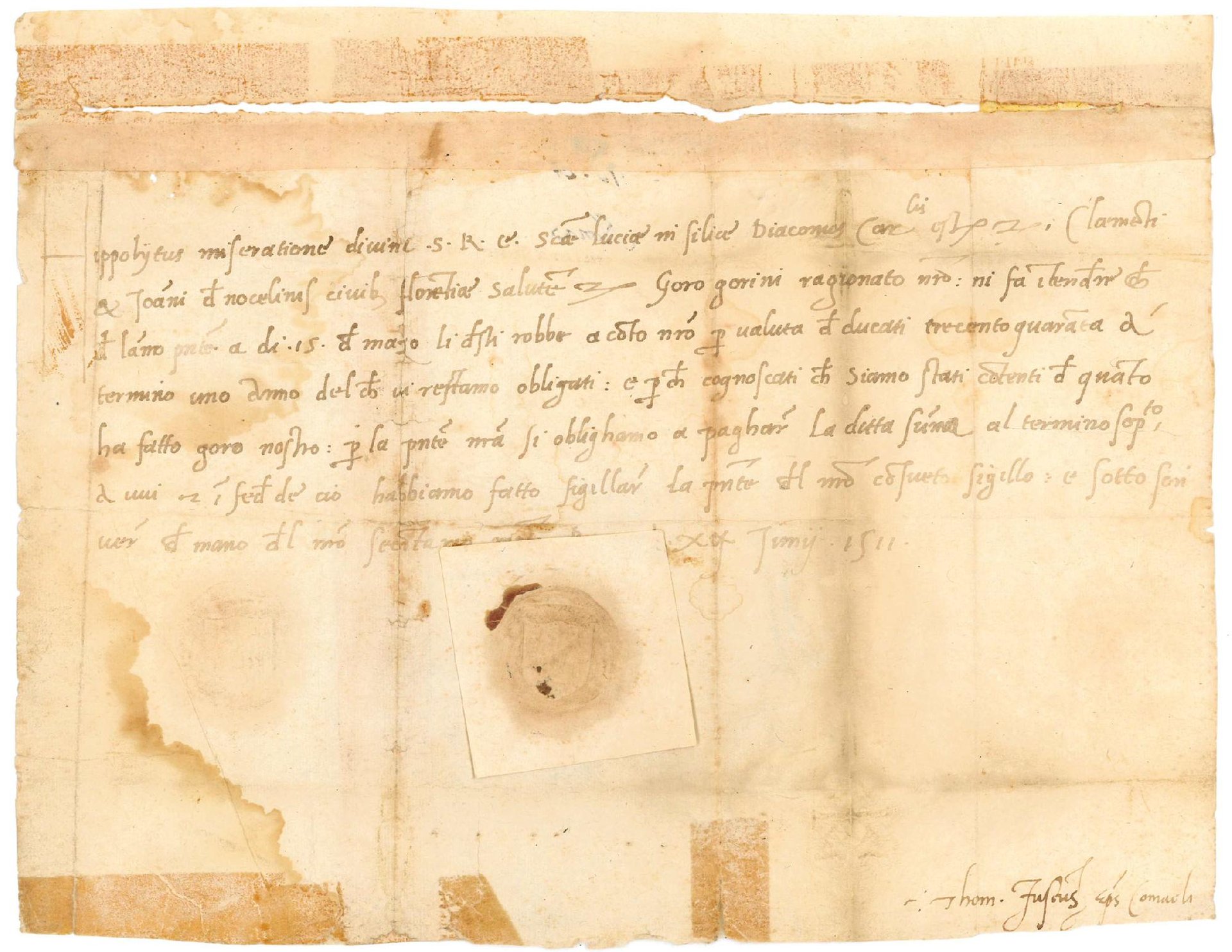 Si tratta di una lettera indirizzata a due cittadini fiorentini, Clemente e Giovanni de Nocelinis, nella quale il cardinale ringrazia per la merce del valore di trecentoquaranta ducati consegnata al suo agente Goro Gorini. Con la presente Ippolito si impegna a pagare la somma pattuita entro un anno dal giorno della consegna, avvenuta il 15 maggio del 1511.