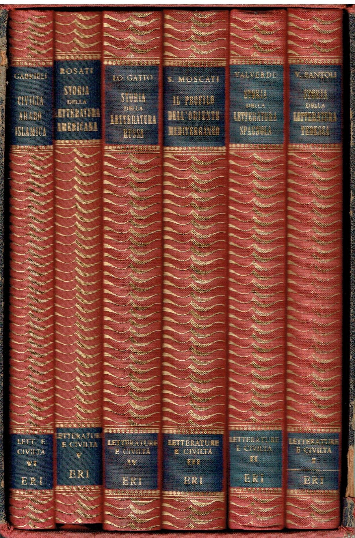 ERI, 1955-1956. 6 volumi in cofanetto della collana "Letterature e civiltà" così composto: 1: Vittorio Santoli: Storia della letteratura tedesca; 2: José M. Valverde: Storia della letteratura spagnola; 3: Sabatino Moscati: Il profilo dell'Oriente mediterraneo, panorami di civiltà preclassiche; 4: Ettore Lo Gatto: Storia della letteratura russa; 5: Salvatore Rosati: Storia della letteratura americana; 6: Francesco Gabrieli: Aspetti della civiltà arabo-islamica. Rilegatura in tutta tela con titoli in oro su tasselli al dorso. Ottimo (Fine) cofanetto sciupato, con piccolo strappo nella tela e bordi consumati, volumi in ottimo stato.