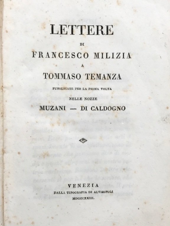 In-8° (cm. 22), brossura muta coeva, pp. [4] 96 in buono stato, lievi fioriture sparse. Dedica manoscritta dell'editore al contropiatto all'abate Giani. «47 lettere dal 1767 al 1776 riguardanti le belle arti, e soprattutto l'architettura [.]; 150 esemplari distribuiti gratis» [Vianello 236]. Buon esemplare. (NJ1)