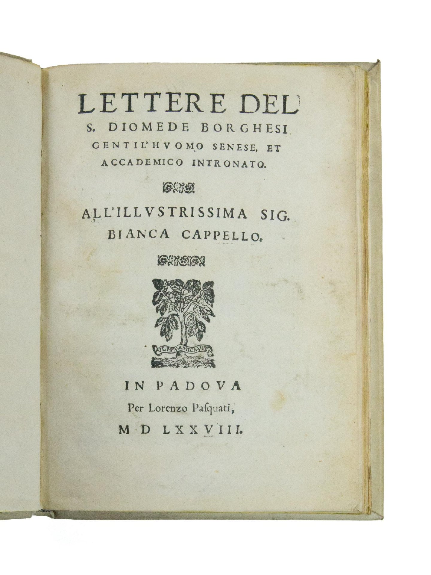 FIRST EDITION, edited by Francesco Salce and dedicated by the author to Bianca Cappello (Padua, August 11, 1578), first lover and then from 1579 wife of Ferdinando de' Medici, of Diomede Borghesi's Lettere famigliari, so called to distinguish them from the Lettere discorsive, which he published in three parts (La prima [-II, -III] parte delle lettere, Padua, Lorenzo Pasquati, 1584; Venice, Francesco de' Franceschi, 1584; Siena, Luca Bonetti, 1603) and in which he exposed his grammatical theories on the Italian language.