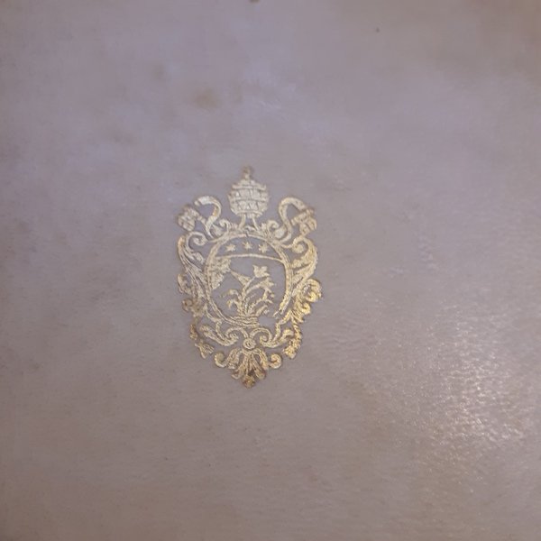 In-4°, 252pp, legatura in piena pergamena alle armi di Pio VI (Giovanni Angelo Braschi 1717-1799) su entrambi i piatti, nervature e tassello con titolo in oro e decorazioni.In-4 °, 252pp, full vellum binding coat of arms of Pius VI (Giovanni Angelo Braschi 1717-1799) on both plates, ribs and label with gilt title and decorations.