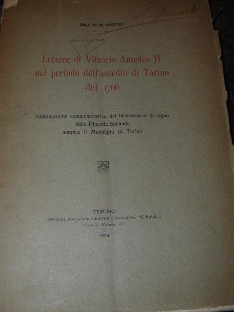Lettere di Vittorio Amedeo II nel periodo dell'assedio di Torino del 1706. Pubblicazione commemorativa del bicentenario di regno della Dinastia Sabauda auspice il Municipio di Torino.