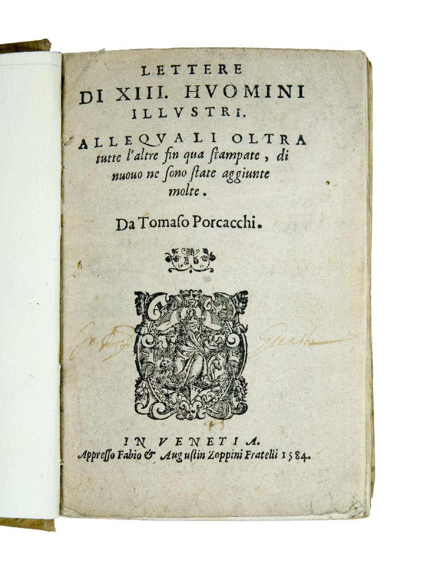 LAST 16TH CENTURY EDITION of the Atanagi/Ruscelli/Porcacchi's collection Lettere di XIII huomini illustri. Porcacchi's edition was first published one year after the last Ruscelli‘s edition (1564) by Giorgio de' Cavalli at Venice with a dedication to Gregorio Macigni, dated November 17, 1565; it contains in addition a new seventeenth book containing thirty-seven letters by eleven authors. It was reprinted in 1566, 1571, 1576, 1582, and 1584 with various typographical variants.