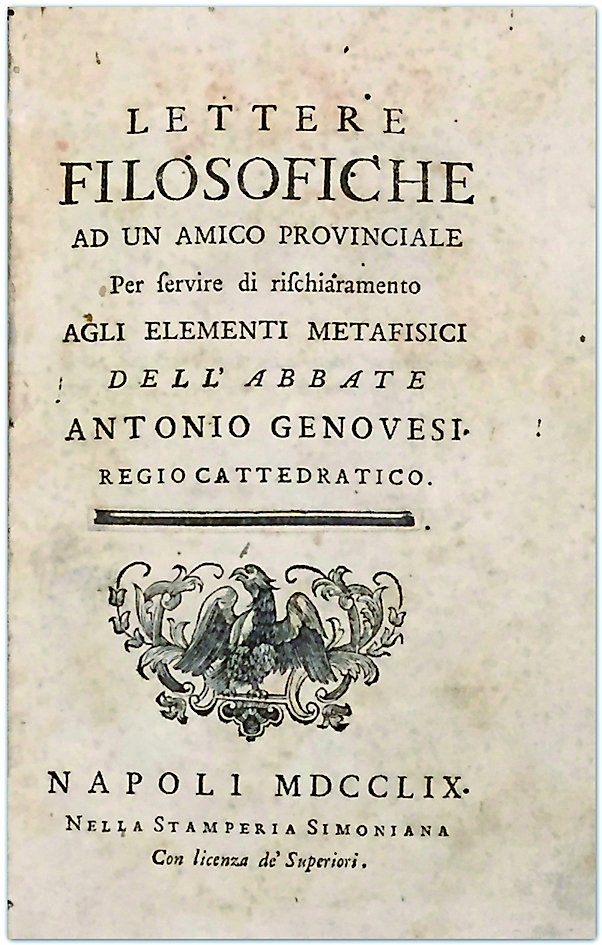 Per servire di rischiarimento agli elementi metafisici. Napoli, Stamp. Simoniana, 1759. Pp. XXXIII. Segue: Dissertazione prima dell’Ab. MAGLI sulla guisa con cui il Signor D. Antonio Genovesi tenta di conciliar l’infinita Beneficenza o Benvoglienza e Amor del Creatore ver le Creature sue Ragionevoli e Libere ... S.l.n.d. (1760). Pp.38 Unito: FRATTASI, Tommaso, Lettera sopra l’ultima infermità di D. Niccolò Messere arciprete e vicario generale di Giovenazzo diretta all’illustrissimo ...Vescovo di Giovenazzo e Terlizzi dal dottor T. Frattasi socio della reale Accademia delle scienze e delle belle lettere di Napoli, e primo medico della citta di Terlizzi... S.l., 1788. Pp. 102. Segue: DE AUSILIO Melchiorre, Lettera Anti-Apologetica intorno la cura del fu arciprete Messere del dottor M. D.A Primo Medico nella Città di Giovenazzo. S.l., Aprile 1788. Pp. 84. Segue: SPADA M, Lettera analitica indirizzata al dottor D. Melchiorre De Ausilio, Primo Medico di Giovenazzo ... S.l., 1788. Pp. 24. Il tutto, formato in-8°, in unica legatura coeva pergamena con titolo in oro al dorso.