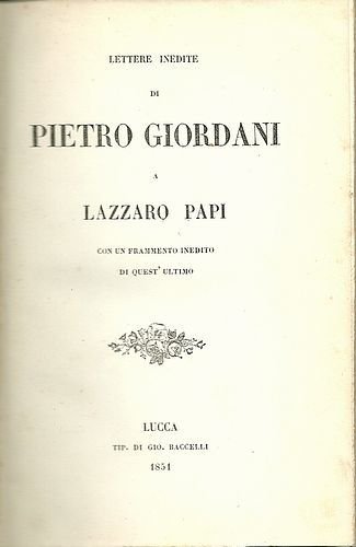 In-16° grande, leg. in tutta tela con tit. in oro al dorso, pp. (6)148. Con il facsimile di una lettera autografa f. testo. Rarissime leggere fioriture; bell'esemplare di questa edizione originale della raccolta di lettere inedite del Giordani allo scrittore e storico toscano, pubblicata postuma. (BIANCARDI - FRANCESE, Prime ed. scrittori italiani, p. 222).