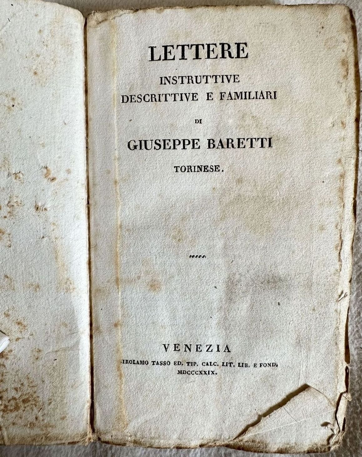 Edizione del 1829 di questa raccolta di lettere istruttive descrittive e familari dello scrittore e critico italiano Giuseppe Baretti (1719-1789). All'inizio notizie sulla vita e opere di Baretti. Seguono le lettere istruttive (della lingua italiana;della corrotta lingua che si parla ne vari stati di Italia; De lalingua che si scrive in Italia debbasi chiamare fiorentina, toscana o italiana); seguono le lettere di viaggio (Ispagna; La festa de tori in Lisbona, Il terremoto in Lisbona, La fiera e i balli d'Elvas, Il coregidor di Talavera, Divertimento di Meaxaras) ecc. In buone condizioni. Copertina morbida coeva con titolo manoscritto al dorso in buone condizioni generali con lievi usure ai margini e dorso. Legatura in buone condizioni. Pagine in buone condizioni con fioriture. In 16. Cm 14,5x8,5. Pp. 202.Edition of 1829 of this collection of educational descriptive and family letters by the italian writer and critic Giuseppe Baretti (1719-1789). At the beginning information about the life of Baretti. The educational letters about italian lòanguage and italian dialects, letters of travel (Ispagna; La festa de tori in Lisbona, Il terremoto in Lisbona, La fiera e i balli d'Elvas, Il coregidor di Talavera, Divertimento di Meaxaras) ecc. In good condition. Soft coeval cover with handwritten title in the spine in good general conditions lightly worn in the extremities. Binding in good conditions. Pages in good conditions with foxing. In 16. Cm 14,5x8,5. Pp. 202.<BR><BR>
