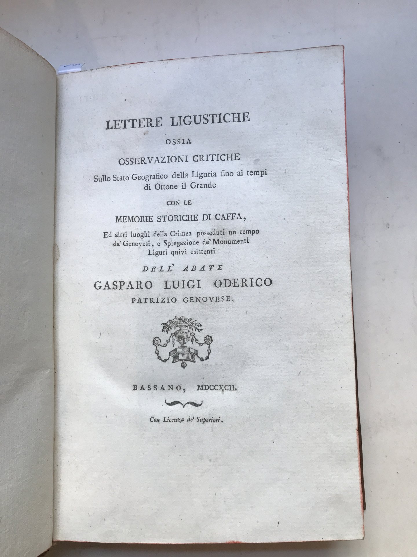 In-8°, pp. XXII, (2), 214, (2), 16 tavv. f.t. rip. incise in rame raffiguranti monumenti sepolcrali, iscrizioni, imprese di famiglie nobili. Bella legatura in pina pelle dell'epoca, dorso a cinque nervi, titolo su tassello e ricchi fregi in oro, tagli rossi. Prima edizione. Bellissimo esemplare assai fresco e su carta forte. Prima edizione di queste lettere di grande interesse per la storia antica della Liguria. Intorno al 1780 l’Oderico, avendone constatata la manchevolezza, rivolse la propria attenzione agli studi concernenti la terra natia onde comporre una storia patria. Fu distolto da questo suo intento dall’imperatrice Caterina di Russia che, conquistata la Crimea, gli affidò l’incarico di scrivere la storia di questa terra durante i due secoli nei quali i Genovesi avevano dominato tale territorio (Caffa di cui trattano alcune delle epistole è l'antica colonia genovese corrispondente all'odierna località di Feodosia). A questa ricerca egli si dedicò con passione, anche perchè gli avrebbe dato ugualmente occasione di scrivere la storia di Genova. Manno, VI, 27345. Platneriana, p. 180. Manca al Lozzi.