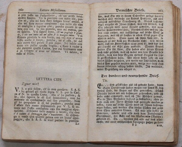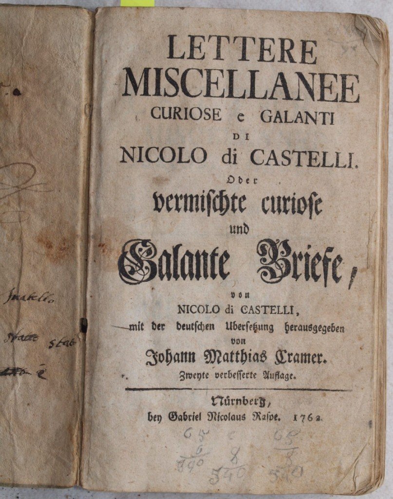 In 16. Dim. 17x10,5 cm. Pp. 509. Bella edizione del 1762 di questa interessante raccolta di lettere curiosi e galante di Nicolo Castelli (Lucca 1601-?). All'interno numerose lettere: testo in italiano con a fronte traduzione in tedesco. Numerosi e vari i temi trattati: moda, costume, etichetta (es. invio di scritti, invio di scarpe su misura alla veneziana, lettera di condoglianze, invio dell'acqua di mandorle amare distillata, malattia, catastrofi naturali, soldi all'usuraio, comportamento scorretto da parte dei servitori ecc.). Due firme alla prima carta bianca: una datata 1773, l'altra probabilmente 1790. In buone condizioni. Raro. Copertina in cartonato coevo con titolo manoscritto al dorso in discrete condizioni generali con usure e parti mancanti ai margini e dorso. Legatura in buone condizioni. All'interno le pagine si presentano in buone condizioni con fioriture e mende. Segni di tarlo marginalie nel testo da pag. 207 a 246 con piccola perdita di lettere. Margine inferiore mancante a pag. 509. Beautiful edition of 1762 of this collection of curious and love letters by Nicolo Castelli (Lucca 1601-?). Insdie there are different letters: italian text with german translation. Different issues are treated: fashion, costume, good manners (es. sending of writings, send of shoes in Venice manner, desease, natural accidents, bad behaviour by servants ecc.). Two signatures in the first white page: one dated 1773, the other probably 1790. In good conditions. Scarce copy. Carton coeval cover with manuscripted title in the spine in fair general conditions with wearings and missing parts in the edges and spine. Binding in good conditions. Inside pages are in good conditions with foxings and usage signs. Wormings in the edges and in the text from pag. 207 until 246 with little loss of letters. Lower edge is missing in pag. 509.