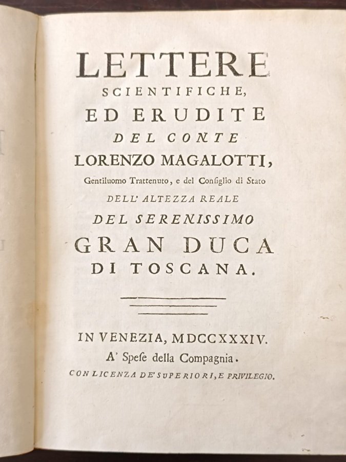 In-8° grande (cm. 23,8), legatura coeva in pergamena marmorizzata, dorso liscio con titolo in oro su tassello e fregi sempre in oro (alcune integrazioni), piatti inquadrati da eleganti cornici di filetti ornati con merletti e fregi floreali sempre in oro (alcune abrasioni), tagli marmorizzati e dorati, risguardi marmorizzati (difetto a un angolo); pp. XXIV 294 [2] in ottimo stato; con graziosi capilettera e finalini silografici. Edizione che ripropone la prima di Firenze del 1721 [cfr. Gamba 1978]. Raccolta di 20 importanti lettere, procurata probabilmente da Tommaso Buonaventuri, tra le quali spiccano la IV, «Sopra la luce», diretta a V. Viviani e la VII, «Sopra un effetto della vista in occasione d'oservar la cometa l'anno 1664»; le altre riguardano la neve, il sangue, il vino, il veleno della vipera, gli odori, l'ovatta, ecc. Cfr. Riccardi II, 63; Graesse IV, 335. Cartellino librario applicato al contropiatto posteriore. Buon esemplare. (NA6)