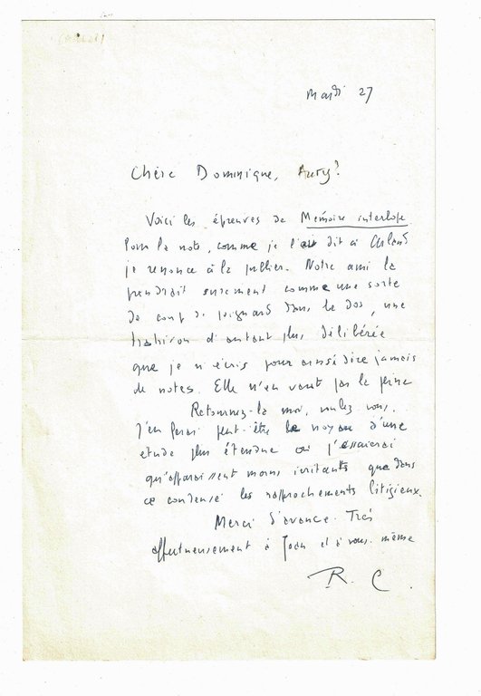 Lettre autographe signée adressée à Dominique Aury