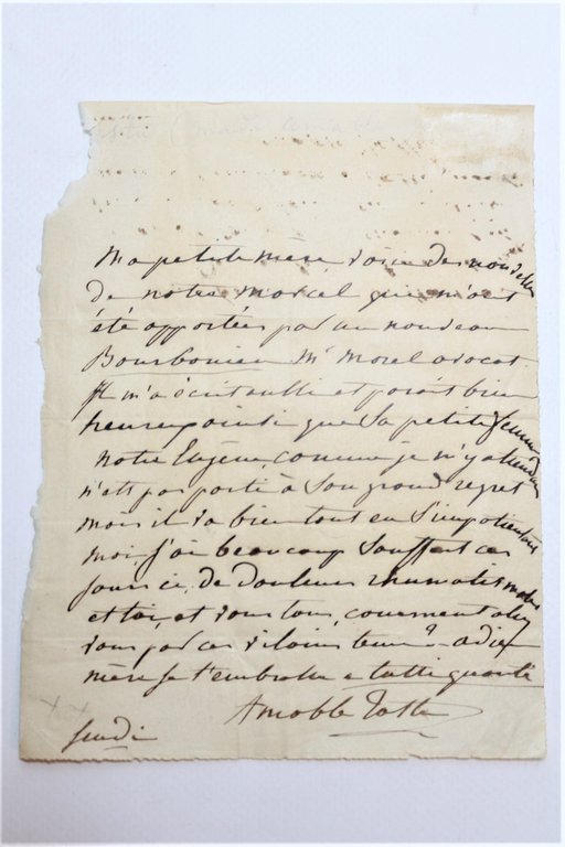 s. d. [circa 1840] | 9.80 x 13.80 cm | une page sur un feuillet | [ENGLISH DESCRIPTION ON DEMAND] | Lettre autographe signée d'Amable Tastu, adressée à sa belle-mère Élise Voïart et rédigée à l'encre noire. Une petite déchirure en marge gauche, sans atteinte au texte.