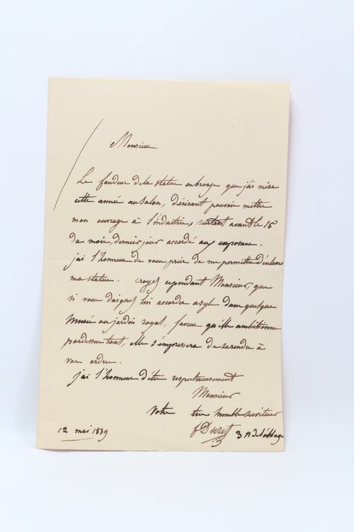 Paris 12 mai 1839 | 13.10 x 20.10 cm | une feuille rempliée | [ENGLISH DESCRIPTION ON DEMAND] | Lettre autographe signée du sculpteur Francisque Duret à propos de l'acquistion par le musée du Louvre d'un exemplaire de sa célèbre statue, le Vendangeur improvisant sur un sujet comique (souvenir de Naples), qu'il présenta au Salon de 1839. L'exemplaire du Louvre (R.F. 172), fondu d'après le modèle de 1839, a été présenté lors de l'Exposition universelle de 1855. 'Monsieur,  Le fondeur de la statue en bronze que j'ai mise cette année au Salon, désire pouvoir mettre mon ouvrage à l'industrie, sourtout avant le 15 du mois; dernier jour accordé aux exposants  [.] croyez cependant Monsieur, que si vous daignez lui accorder asyle dans quelque musée ou jardin royal, faveur qu'elle ambitionne par dessus tout, elle s'empressera de se rendre à vos ordres [.].