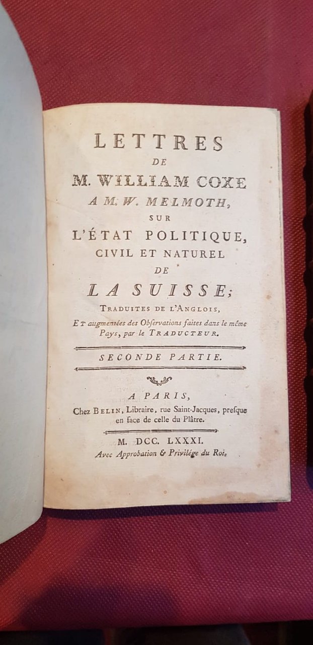 Lettres de M. William Coxe a M. W. Melmoth, sur l' état politique, civil et naturel de la Suisse; traduites de l' Anglois, et augmentées des Observations faites dans le même Pays, par le traducteur.