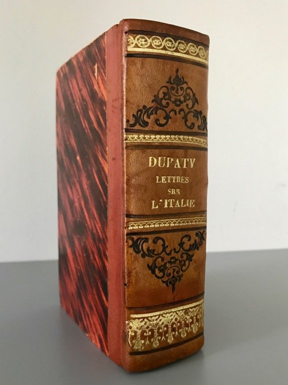 3 volumi in 1 in-12° (cm. 13,7), bella legatura coeva in mezzo vitello con titolo e decorazioni romantiche in oro e nero al dorso, tagli marmorizzati; pp. [4] 200, [4] 200, [4] 170 in ottimo stato, con 3 tavole illustrative in rame in antiporta di Delvaux (ritratto dell'autore, bacio alla driade, mercato d'amore). Resoconto del viaggio di Dupaty in Italia compiuto per studiarne i sistemi giuridici vigenti e le procedure penali. L'opera ricca d'impressioni romantiche godette di successo letterario e fu anche all'Indice. Ottimo esemplare. (NG2)