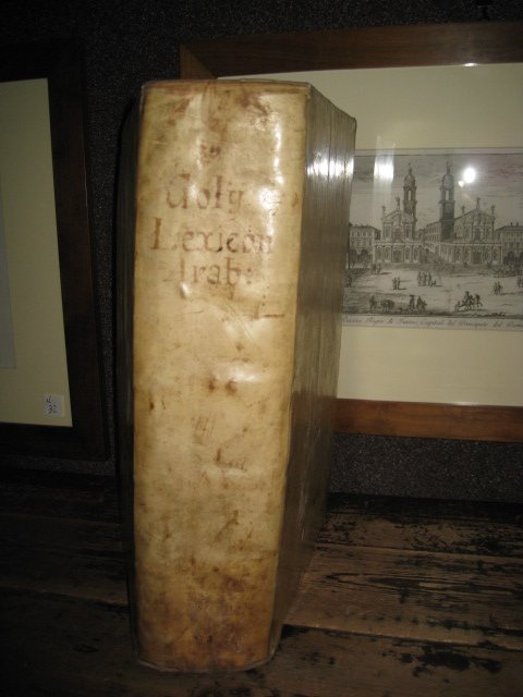 In-folio (375x235mm), cc. (6), colonne 2922 [i.e. 2920; la numerazione è per colonne anziché per pagine], cc. (20) di 'Epilogus sive admonitio', legatura coeva p. pergamena rigida con titolo manoscritto in antico al dorso. Testo bicolonne latino ed erabo, fregi xilografici, impresa elzeviriana al titolo impresso in rosso e nero. Firma di possesso antica al verso del titolo. Lievi gore e fioriture, piccolo restauro al margine inferiore della c. con colonne 1412-1413. Ottimo esemplare nell'insieme. Prima edizione, impressa dagli Elzeviri (per la precisione da Jean e Daniel, che, per un atto di devozione filiale, lo fecero perù uscire come pubblicato dai loro ascendenti), del monumentale lessico latino-arabo del Golius (L'Aja, 1596-Leida, 1667), fra i maggiori orientalisti del suo tempo. L'opera, basata sulla Sihah di al-Jawhari, è la più importante del Golius e, integrando e superando il precedente lessico del Raphelengius, fece a lungo scuola presso gli studiosi occidentali della lingua araba, prima di essere a sua volta rifuso nel 'Lexicon arabico-latinum' dek Freytag del 1830. 'Le Lexique de Golius, a été longtemps le meilleur qu'on eût de la langue arabe. Véritable monument typographique, dont l'impression avait duré des années et avait offert des difficultés extraordinaires' (Willems). Willems, 723. Haywood, Arabic Lexicography, p. 123. OCLC 312103043.