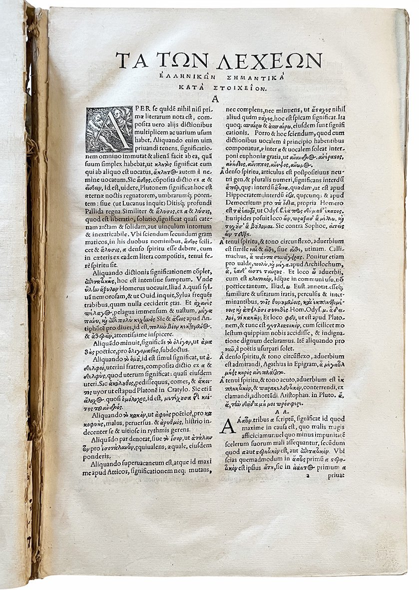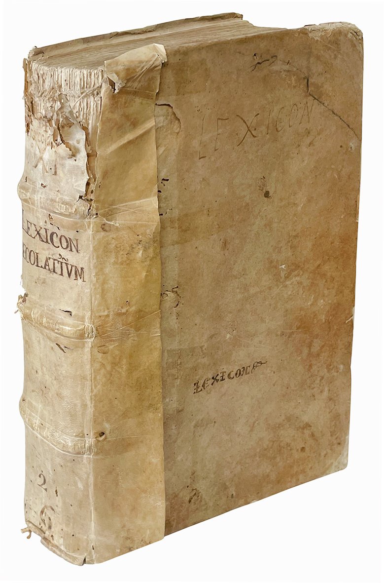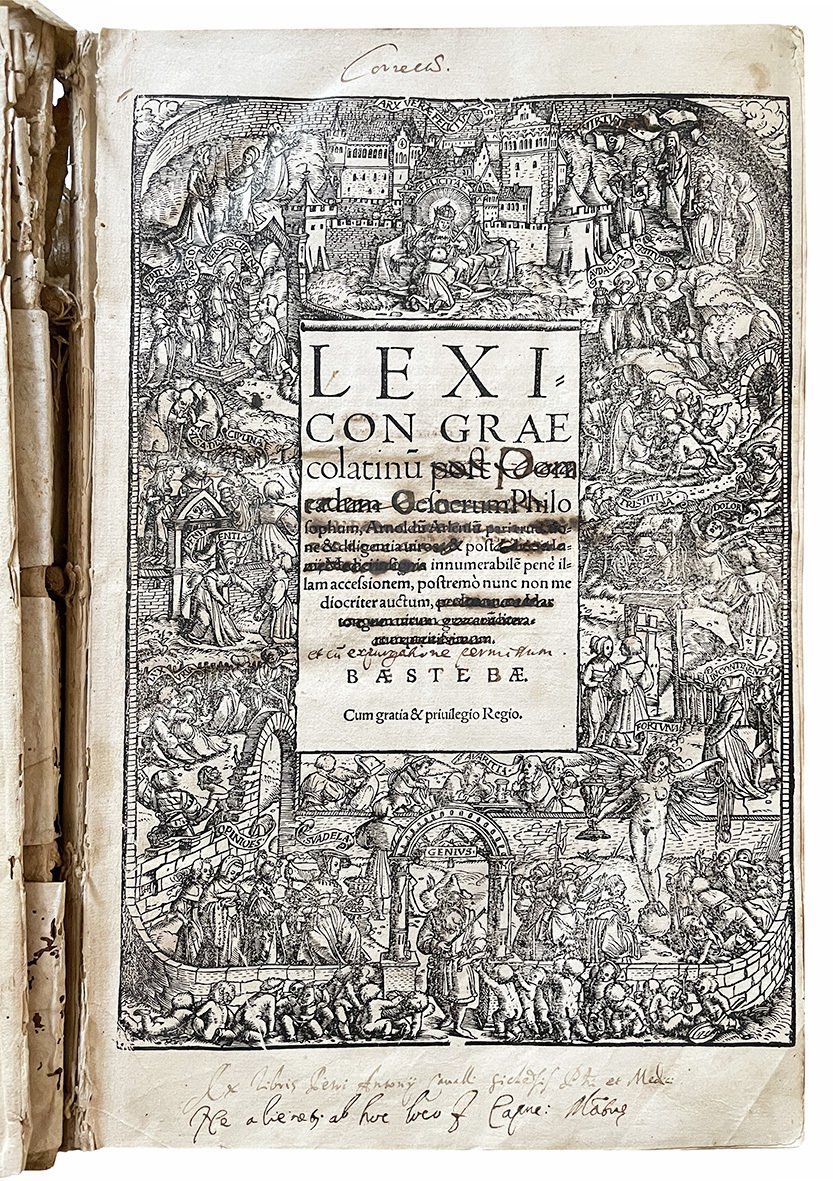 In folio (mm 328x205); cc. [534]. Segnatura: †6 a6 b-zz8 Aa-Qq8 Rr-Ss6 α-γ6 δ4. Frontespizio entro cornice xilografica, marca editoriale xilografica al verso di c δ4. Colophon a c. δ4r. Iniziali xilografiche. Testo stampato su due colonne. Lievi aloni diffusi, lievi fioriture e alcune carte un po' brunite. Restauro al margine inferiore di c. S6. Incollate le cc. Ss5 e Ss6. Ex libris cartaceo applicato al contropiatto anteriore (“C. L. Cavriani”). Firme di appartenenza al risguardo e al titolo (“Jo. Bapt. Ferrarius”, “Ex libris Petri Antonii Cavalli”). Frontespizio e carta di dedica censurati, trattandosi di un esemplare espurgato come indica una nota al titolo (“et cum expurgatione permussum”). Pergamena seicentesca con titolo manoscritto al piatto anteriore e al dorso, dorso rinforzato anticamente (staccato). Mancanze marginali ai piatti. Forellini, segni di tarlo e mancanze varie al dorso. Primi fascicoli sciolti. Volume da studio interessante per le provenienze e le censure dei nomi sul titolo e nella dedica.