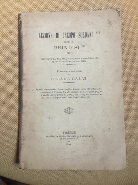 Lezione di Jacopo Soldani sopra il brindisi. Recitata da lui nell'accademia fiorentina il di 20 di gennaio nel 1597.