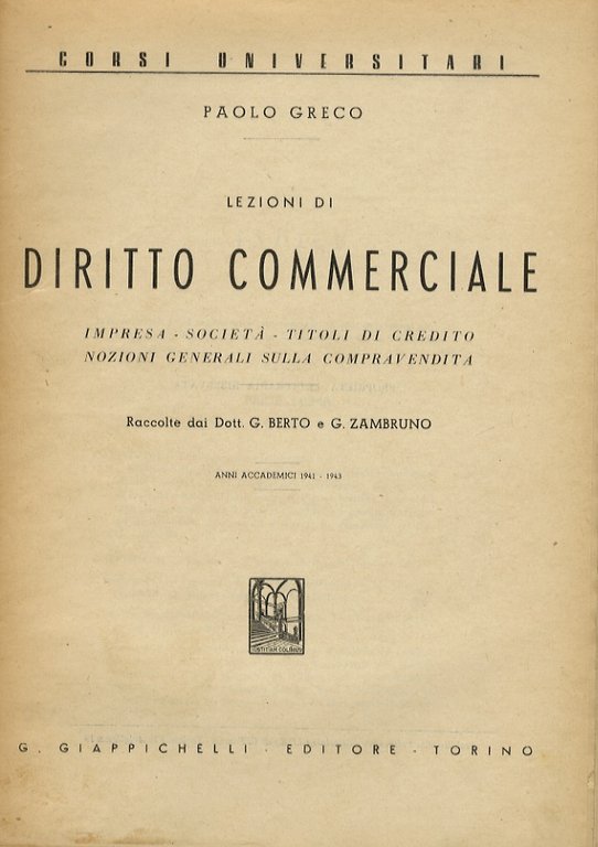 Lezioni di diritto commerciale. Impresa. Società, Titoli di credito. Nozioni generali sulla compravendita. Raccolte dai Dott. G. Berto e G. Zambruno. Anni accademici 1941-1943.