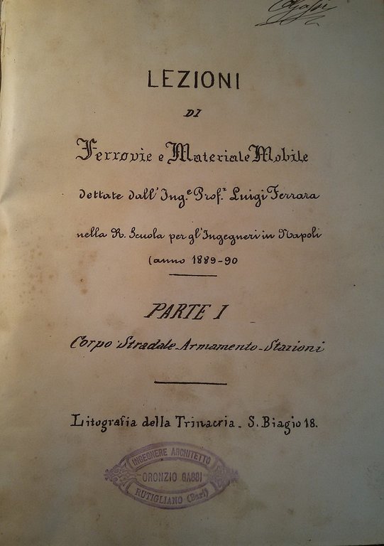 parte I: corpo stradale armamento stazioni. Lezioni di ferrovie e materiale mobile, parte II: materiale mobile. Lezioni di ferrovie e materiale mobile, appendice alla parte I: gallerie. STUDIO SULLE FERROVIE DI MONTAGNA di A. Corrado. TRAMVIE (autore ignoto) Napoli, Litografia della Trinacria 1889 - 90.