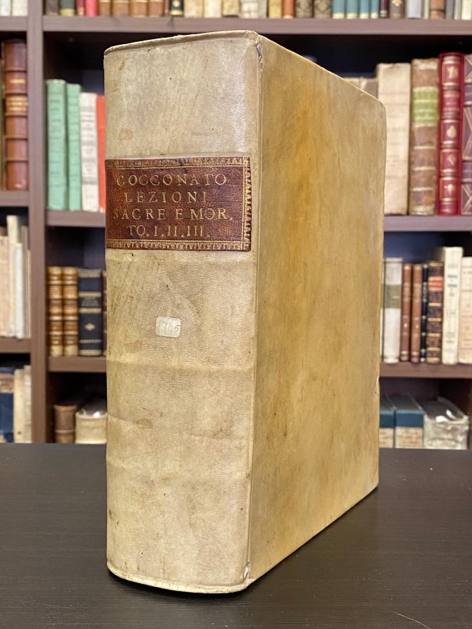 <span style="font-style: normal;">3 volumi in 1 in-4° (cm. 23), solida legatura coeva in piena pergamena con titolo in oro su tassello al dorso liscio (lievi tracce d'uso), tagli spruzzati in blu; pp. [8] 432, [4] 384, [4] 416 in stato molto buono (lievi fioriture sparse, alcuni segni di tarlo al margine interno bianco e altri al margine esterno delle ultime carte senza fastidio al testo, antica firma di possesso al frontespizio del tomo I del beato Placido Riccardi); bella vignetta allegorica in xilografia ai frontespizi raffigurante Minerva con il motto «La Felicità delle Lettere»; graziose testatine, capilettera e finalini sempre xilografici. Pregevole edizione veneta di quest'opera in tre tomi, che contiene: al tomo I. </span><i>Dalla creazione del mondo sino alla nascita di Noè</i>; al tomo II <i>dalla nascita di Noè alla seguita morte di Abramo</i>; al tomo III <i>dalla morte d'Abramo sino alla morte di Giuseppe ultimo compimento del libro</i>. Esemplare molto buono. (NP7)
