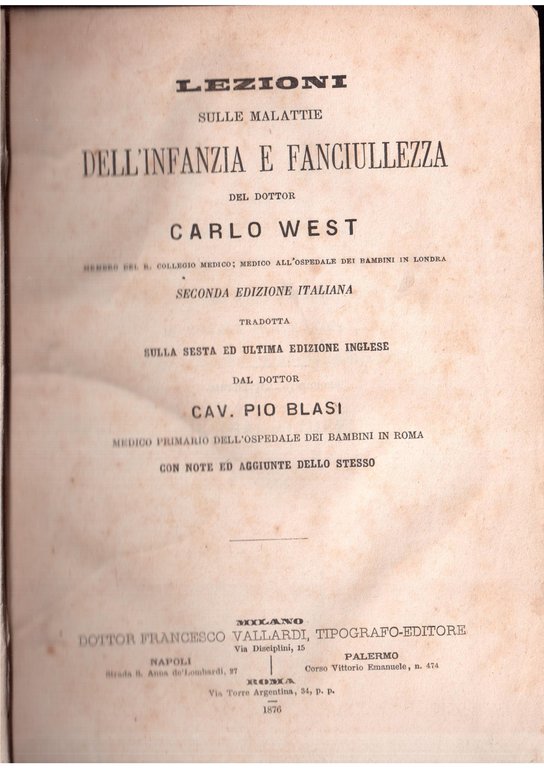 Lezioni sulle malattie dell'infanzia e fanciullezza seconda edizione italiana tradotta sulla sesta ed ultima edizione inglese dal dottor Cav. Pio Blasi medico primario dell'ospedale dei bambini in Roma