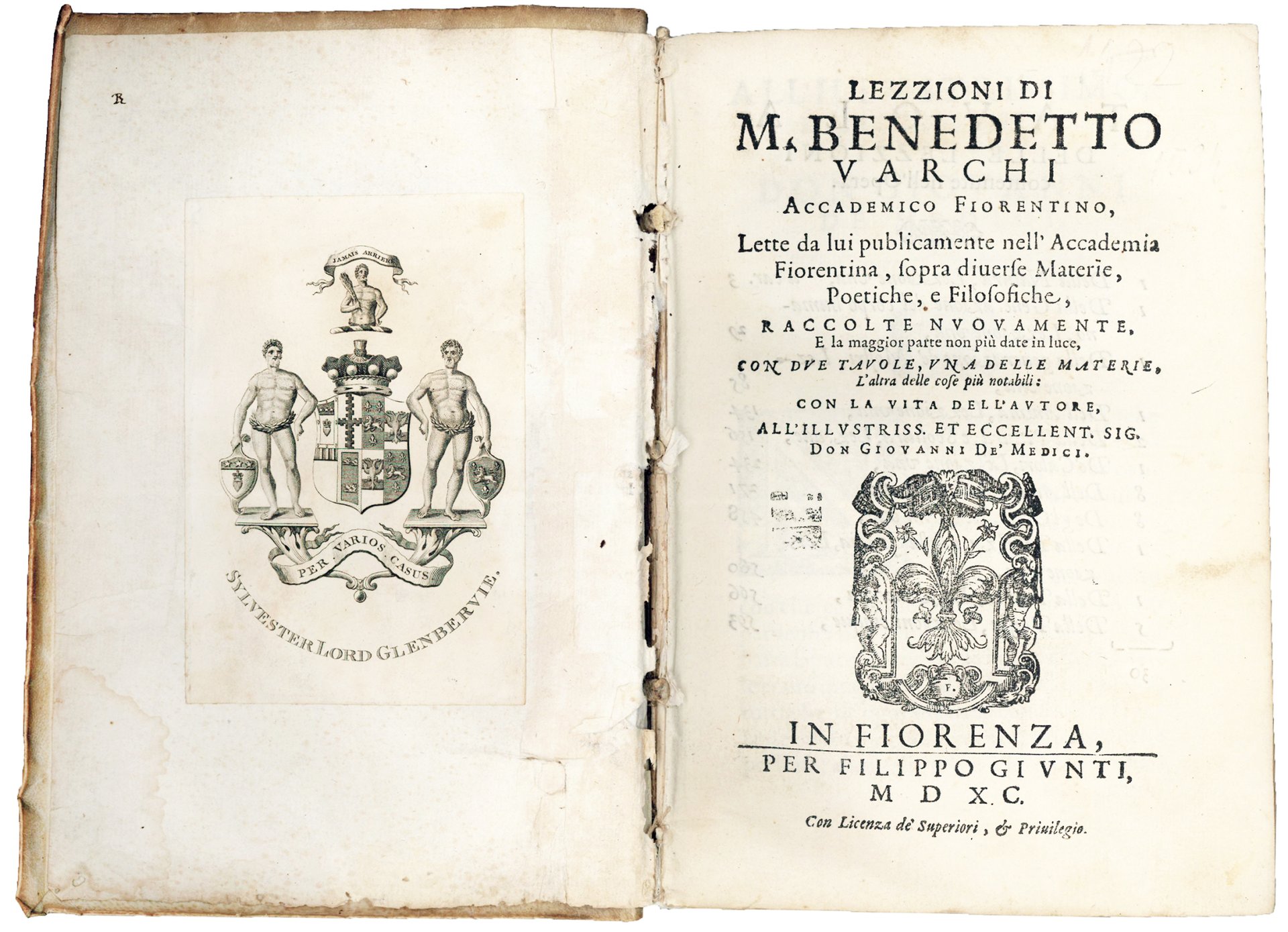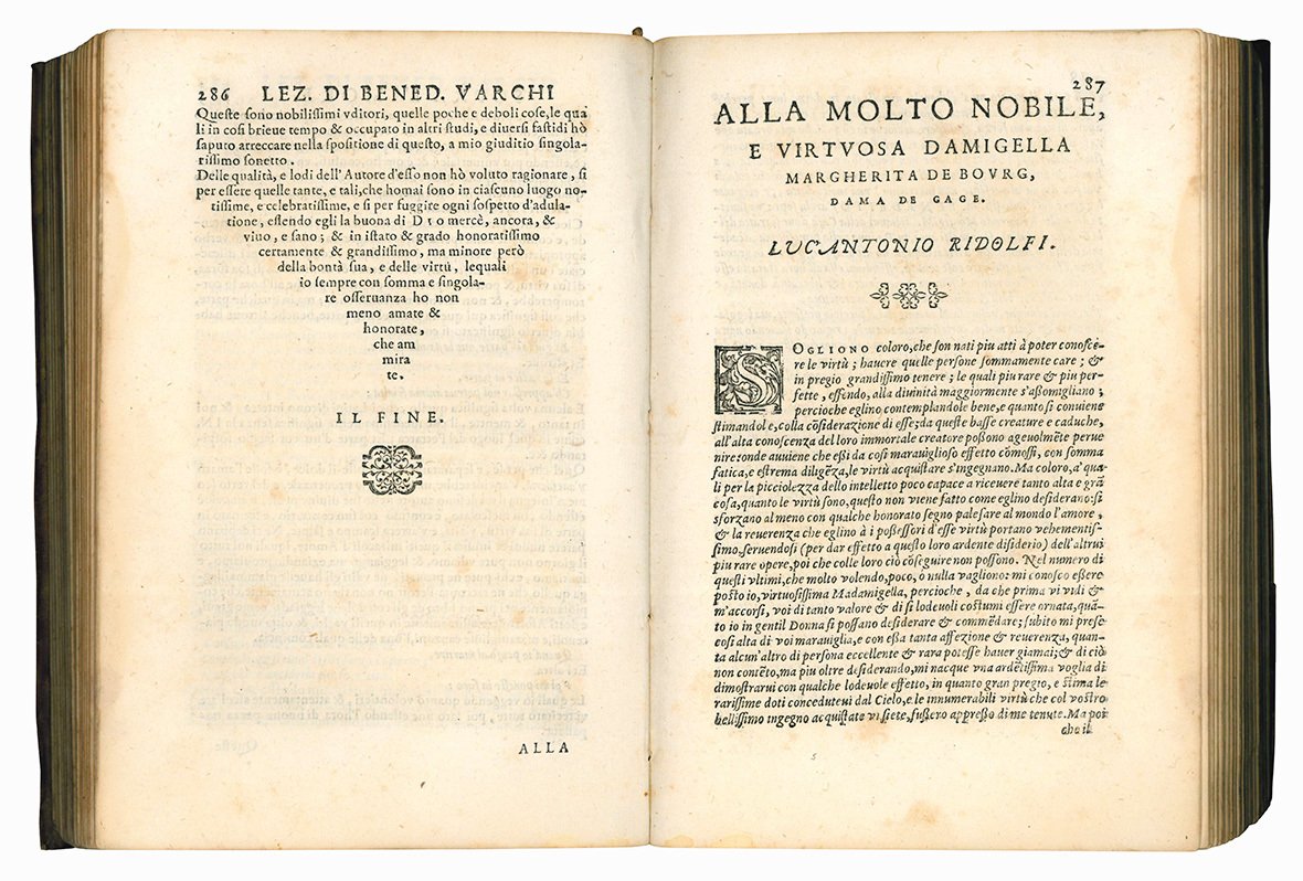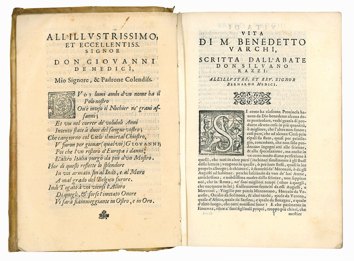 Il volume, che si apre con una lettera dedicatoria a Giovanni de' Medici da parte dello stampatore Filippo Giunta, datata 8 febbraio 1589, contiene in tutto trenta “lezzioni” e fu curato da Silvano Razzi (1527-1611), originario di Marradi presso Firenze e proveniente da una famiglia di notai, che nel 1559 entrò nell'ordine dei frati camaldolesi presso il monastero di Santa Maria degli Angeli a Firenze. Scrisse tre commedie e nel 1565 divenne membro dell'Accademia Fiorentina e amico intimo di Benedetto Varchi, che compose per lui quaranta epigrammi (1563-1564). Strinse legami di amicizia con tutti i maggiori scrittori fiorentini dell'epoca, stabilendo anche stretti rapporti con Giorgio Vasari. Razzi divenne l'editore di diverse opere di Varchi e il suo esecutore testamentario. Fu anche autore di numerosi trattati religiosi e morali e di opere storiche, oltre che della prima biografia di Varchi pubblicata nel presente volume (cfr. P.G. Riva, Silvano Razzi, in: “Dizionario biografico degli italiani”, Rome, 2016, vol. 86, 2016, pp. 649-651; cfr. anche S. Lo Re, Biografie e biografi di Benedetto Varchi, in: “Archivio storico italiano”, 156/4, 1998, p. 681).