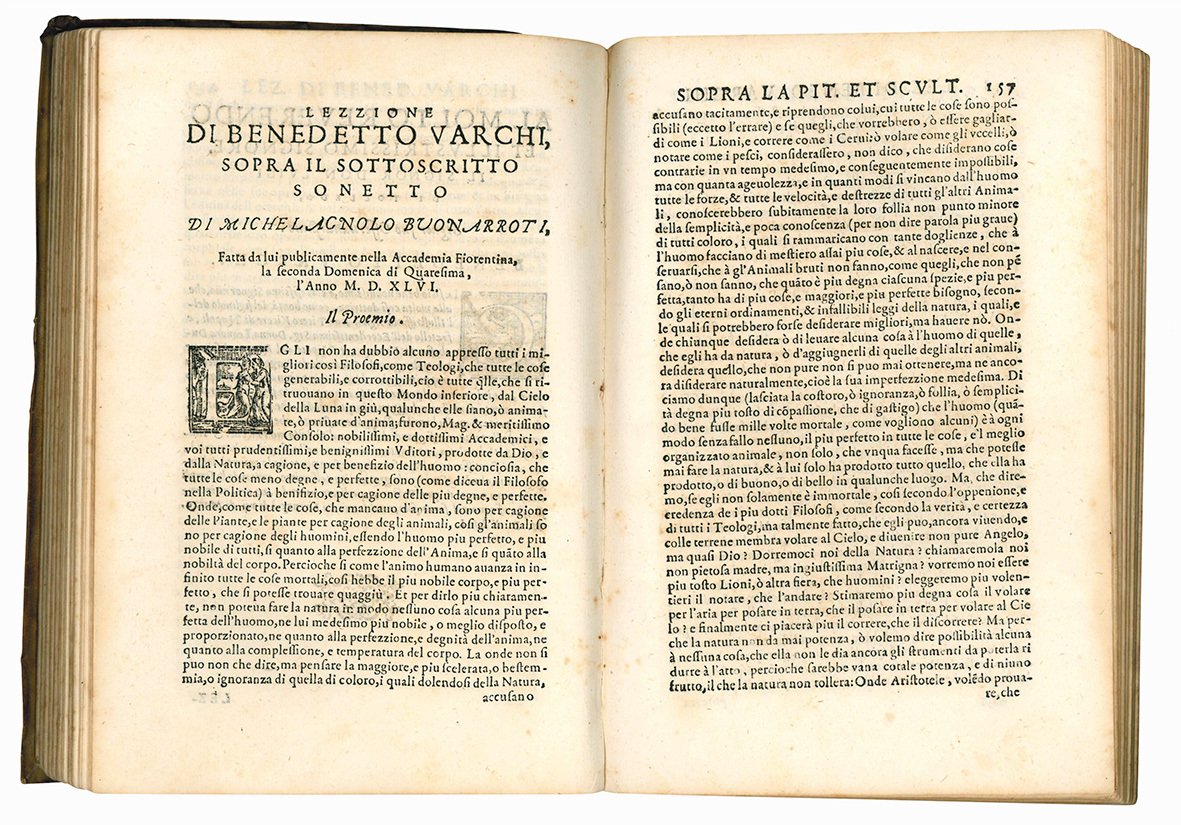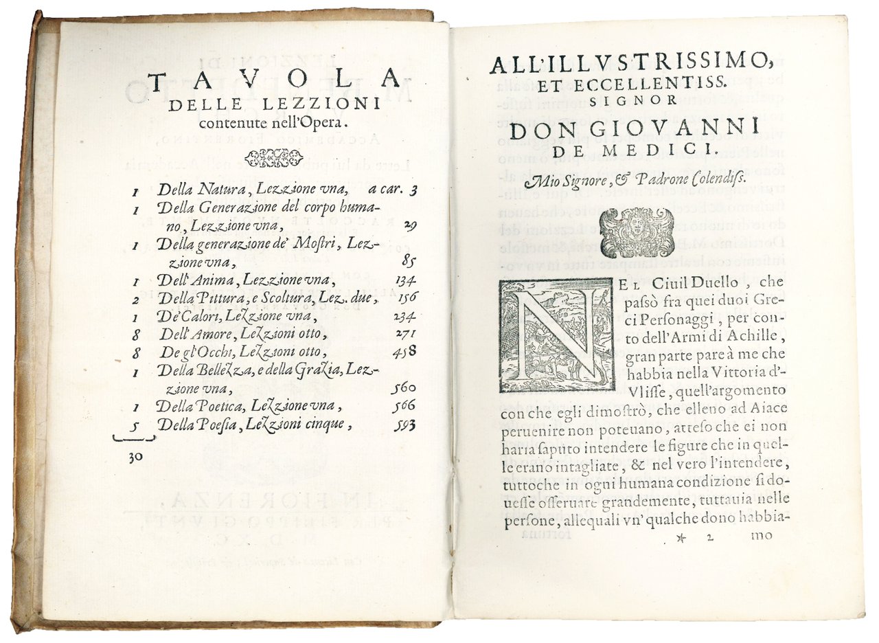 Al verso del frontespizio è riportato un indice dell'opera, Tavola delle Lezioni contenute nell'Opera, che elenca trenta lezioni. Le prime tre, Della Natura (pp. 3-27), Della Generazione del corpo umano (pp. 29-84) e Della generazione de' Mostri (pp. 85-32) erano già state pubblicate ne La prima parte delle Lezzioni, stampata dai Giunta nel 1560. La lezione successiva, Dell'Anima (pp. 133-154), che si ricollega al Canto XXV del Purgatorio di Dante, fu stampata per la prima volta nel presente volume (cfr. A. Andreoni, La via della dottrina. Le lezioni accademiche di Benedetto Varchi, Pisa, 2012, p. 18). In Della Pittura, et Scoltura (pp. 156-231) sono riunite due delle lezioni di Varchi che hanno certamente attirato la maggiore attenzione della critica: quella sul celebre sonetto di Michelangelo “Non ha l'ottimo artista alcun concetto”, che non solo rappresenta la consacrazione ufficiale della poesia michelangiolesca (cfr. S. Lo Re, Varchi e Michelangelo, in: “Annali della Scuola Normale Superiore di Pisa”, ser. 5, 4/2, 2012, p. 514), ma anche il punto di partenza di tutte le possibili interpretazioni della teoria artistica michelangiolesca, e quella che si articola in tre dispute riguardanti rispettivamente la nobiltà delle arti, i meriti della pittura e della scultura, le differenze e le analogie tra poeti e pittori. Per la prima volta nella storia dell'arte, diversi artisti viventi furono chiamati a partecipare alla “discussione-paragone” sulla su