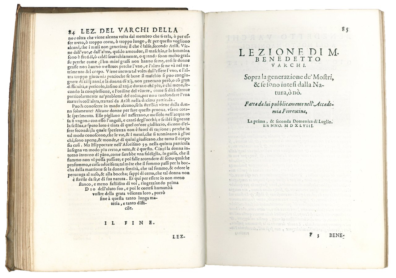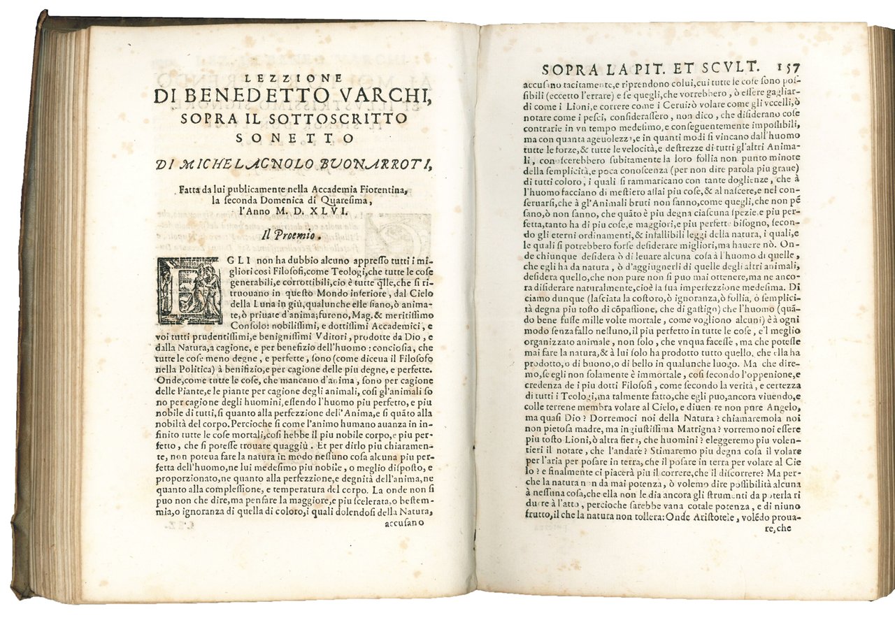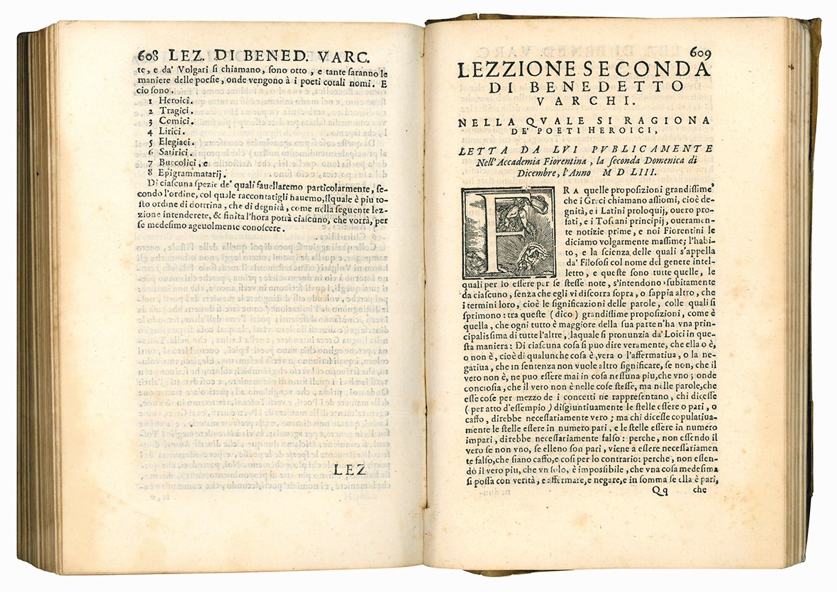 Prima edizione collettiva delle lezioni di Varchi tenute all'Accademia Fiorentina. L'Accademia fiorentina fu fondata a Firenze il 1° novembre 1540 come Accademia degli Umidi, in contrapposizione o parodia del nome dell'Accademia degli Infiammati di Padova, appena fondata. I dodici membri fondatori erano Baccio Baccelli, Bartolomeo Benci, Pier Fabbrini, Paolo de Gei, Antonfrancesco Grazzini, Gismondo Martelli, Niccolò Martelli, Giovanni Mazzuoli, Cynthio d'Amelia Romano, Filippo Salvetti, Michelangelo Vivaldi e Simon della Volta. Entro 15 mesi dalla sua fondazione, il 25 febbraio 1541, l'accademia cambiò nome in Accademia Fiorentina, come richiesto Cosimo de' Medici.
