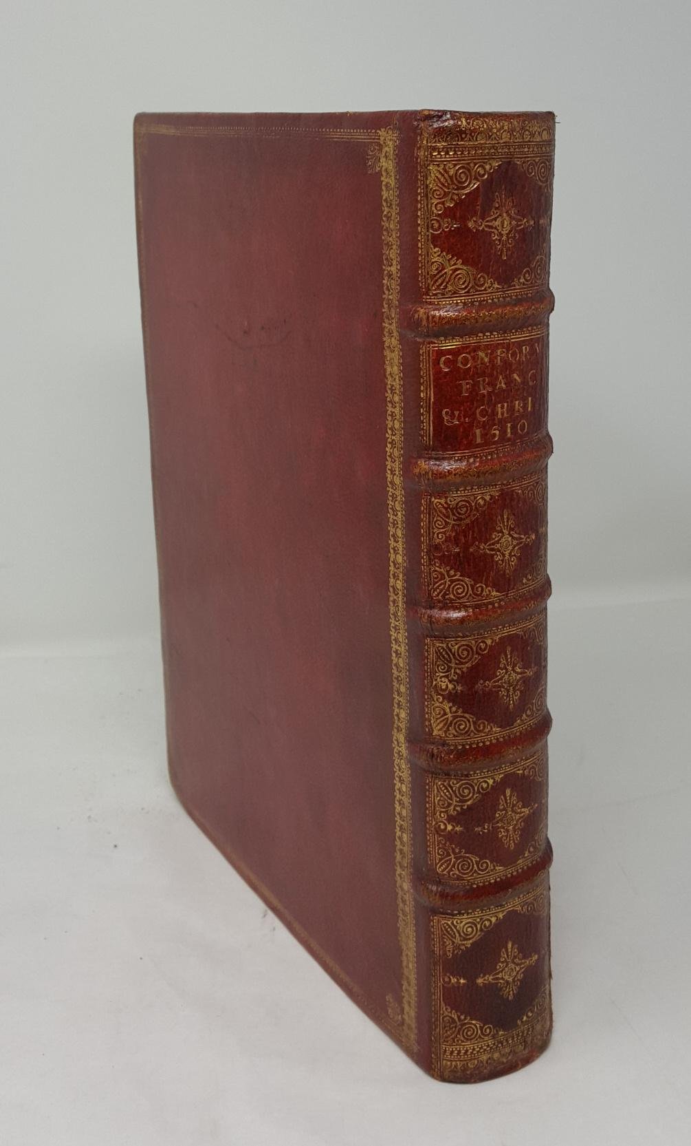 >in-folio, (mm 273x198), ff. (4), CCLVI ff. legatura del primo Settecento in marocchino rosso, titolo e data su tassello e ricchi fregi in oro al dorso, ai piatti bordura e fregi angolari in oro. Al frontespizio bordura a racemi, una grande vignetta con Francesco che riceve le stimmate e grande impresa di Gotardo da Ponte; al verso grandiosa silografia che raffigura Francesco ai piedi di un albero "genealogico" delle 40 conformità, sul quale è crocefisso Cristo; Mortimer nota che ''this representation of the material of the text in the form of a tree was part of the original manuscript submitted by Bartholomaeus for approbation in 1399'' (Harvard, It. n.44). Nel testo, tre ripetizioni del legno delle stimmate e varie grandi capilettera istoriate. Prima edizione dell'opera che ha assicurato per secoli larga fama al frate minore Bartolomeo de Rinonichi, professore nei ginnasi di Padova, Siena e Pisa e predicatore illustre. Composto tra il 1385 e il 1390, e approvato ufficialmente dall'Ordine il 2 agosto 1399, durante il Capitolo generale di Assisi, sviluppa sino alle ultime conseguenze il tema della conformità tra la vita di Cristo e quella di s. Francesco, unico fra tutti i santi ad avvicinarsi in maniera totale al proprio modello divino. L'opera, divisa in tre grandi libri, mette a profitto la maggior parte delle fonti disponibili nella seconda metà del Trecento, compresi gli scrittori francescani spirituali; con una serie di parallelismi sintetici tra i due: come la vita di Gesù ha avuto quaranta frutti spirituali altrettanti ne darà la vita di s. Francesco. Lo scritto ebbe enorme diffusione e sollevò opposizioni fra i protestanti: un violento opuscolo del 1542 di Erasmus Alberus ebbe nella sua traduzione tedesca una prefazione di Martin Lutero. L'edizione è celebre anche perché, dal verso del f. CCII al recto di CCIII, comprende la prima apparizione a stampa del "Cantico delle Creature", anche noto come Cantico di Frate Sole, il più antico testo poetico della letteratura italiana che si conosca; la sua stesura risalirebbe a due anni prima della morte di San Francesco (1226). I margini non grandi di questo esemplare in bella legatura fanno sì che il primo foglio risulti rifilato: al recto manca il solo filetto inferiore della cornice, mentre al verso la bordura è priva di 4 mm sui tre lati; restauro al margine esterno dei ff. G7-8. Olschki, Choix 4567; cf. Mortimer/Harvard (Italian), 44. Santoro, Illustrati milanesi 117. Sander I, 204.