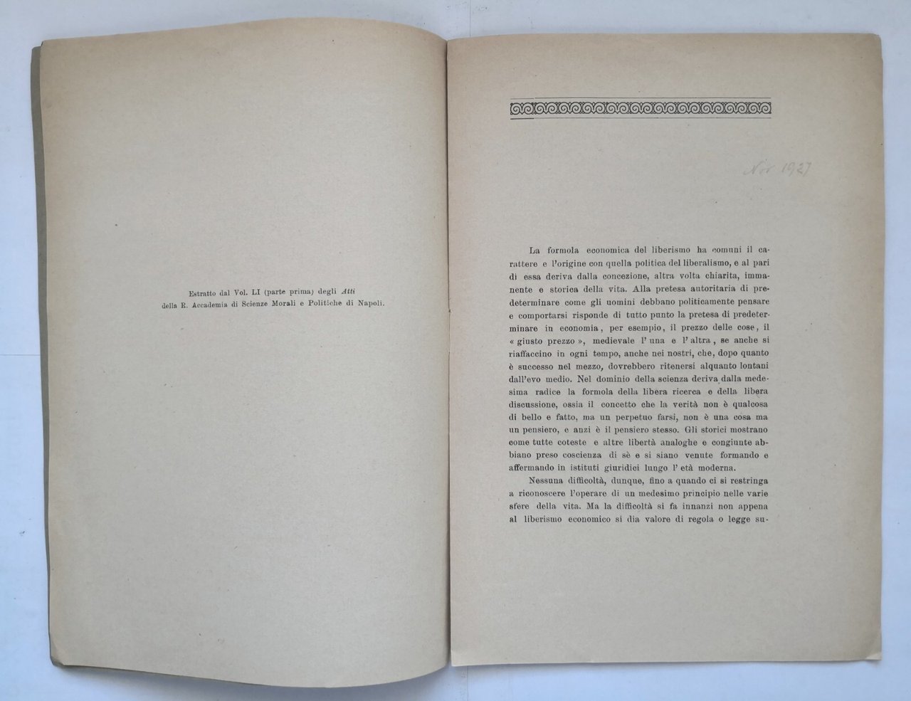 LIBERISMO E LIBERALISMO. Nota letta all'Accademia di Scienze Morali e Politiche della Società Reale di Napoli dal socio Benedetto Croce.